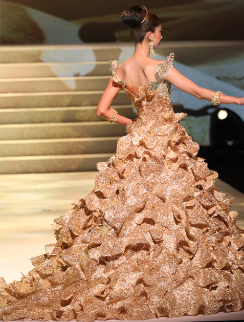 A spectacular ball gown dress in stereoscopic gold lace with 20,00 brilliant Swarovski elements.