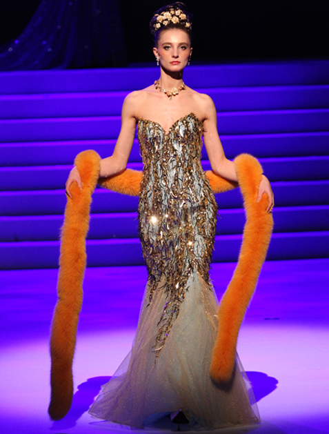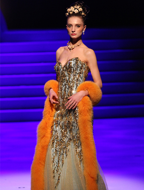 Various embroidered motifs inspired by the artworks of Gustav Klimt. The strapless neckline and orange stole accent the femininity.