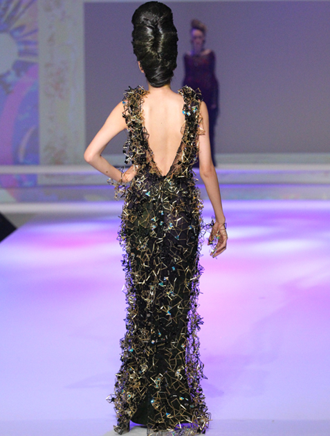 A flourish of Swarovski crystals and beaded bamboo enlivens this black dress with a sleek, gorgeous sensuality.