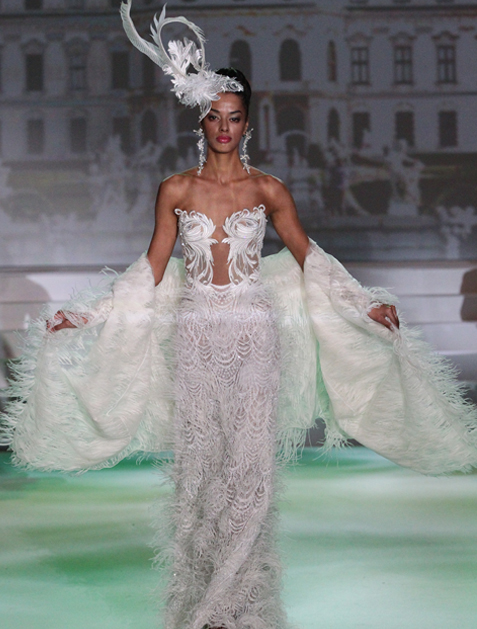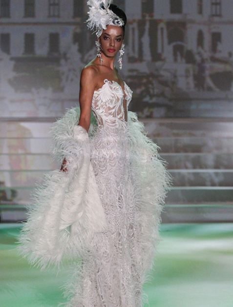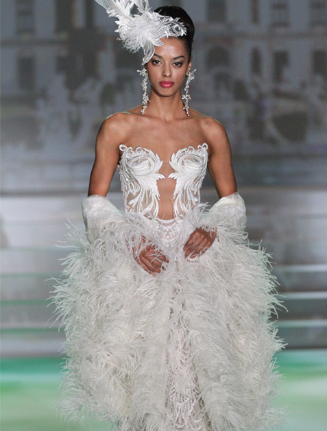 A strapless Yumi line dress in fluffy Ostrich feather. The tattoo neckline blends with the skin for a sensual, sophisticated effect.