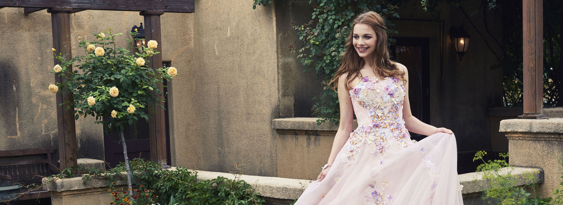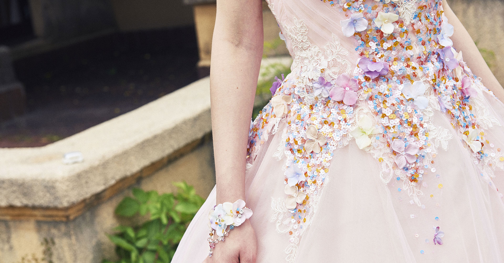 ご着用時にアトリエの専門スタッフによる綿密なフィッティングが行われ、お悩みをカバーするお直しとアレンジにより、まるで一点ものをオーダーしたかのような美しいラインを実現いたします。白のウェディングドレスとは趣が大きく異なるカラフルなユミカツラのカラードレスは、祝宴に花を添えるのに最適な一着となります。
