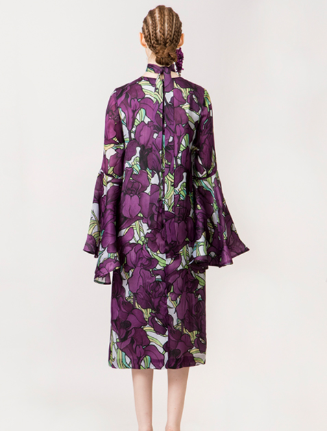 A Light and three-dimensional,flared sleeves dress, made of silk.