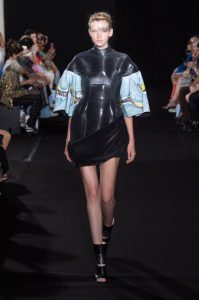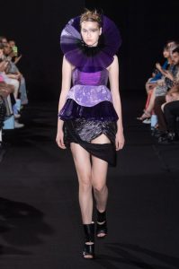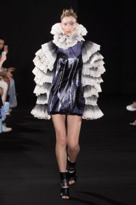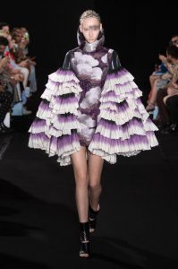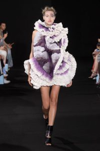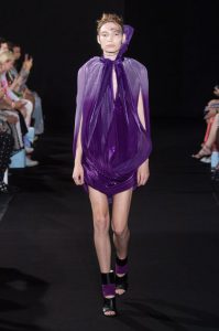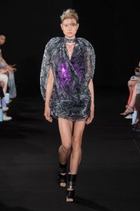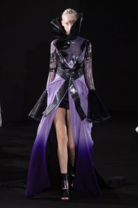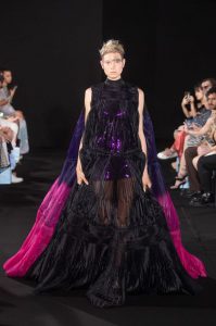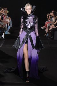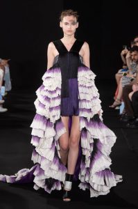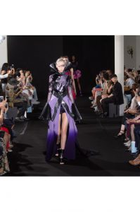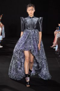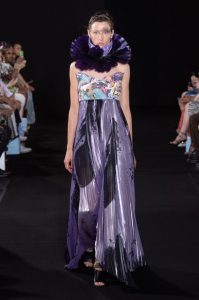 The new collection presented 25 dresses inspired by the beauty of Japanese calligraphy, expressing powerful and elegant straight lines, with pleats and Japanese traditional techniques – “suminagashi” (marbling ink) and gradation dyeing.