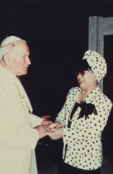 Yumi Katsura helped preserve traditional techniques for making kimono and obi materials in the 1980s by developing new fabrics from Hakata-ori and Nishijin-ori weaving and Saga-nishiki brocade as novel materials for haute-couture dresses. Then her flexible, inventive spirit led her to a surprising step. To show the world the gorgeousness of Hakata-ori weaving, she decided to present Pope John Paul II with a formal vestment made from it. Having heard of the Pope’s aversion wearing heavy garments, she saw an opportunity to promote Hakata-ori, a fabric renowned in Japan for its “thin and lightweight splendor.” She designed a special material with pure gold leaf in the weave and a motif of pansies, the national flower of Poland, the Pope’s homeland. The garment took a full two years to complete from the day she placed the order. In 1993, three months after receiving the gift, the Pope wore the vestment to an Easter mass broadcast worldwide. “Tears rolled down my cheeks when I received the Pope’s thank-you note,” she recalls, adding that it reinforced her sense of mission to “transmit Japanese beauty to the world.”