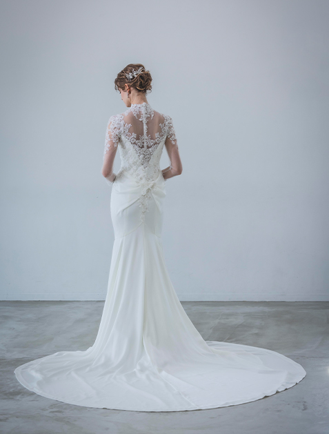 For brides seeking a slender silhouette and classical elegance with modest coverage, Yumi Katsura’s Yumi Line is ideal. The gown features delicate lace with a sheer quality and a clever use of beige fabric under the deep V-back for comfort and confidence. The luxurious georgette material enhances feminine curves, ensuring a captivating presence.