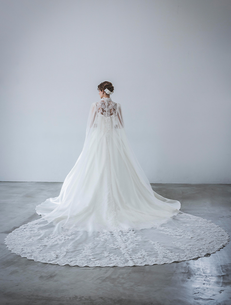 Meet the Mantle Train dress, fulfilling brides’ wishes for overseas weddings and a favorite from our Cel Dresses collection. Pair it with an authentic, grand silhouette ideal for cathedral settings to achieve a sophisticated bridal style. The Mikado fabric’s sheen contrasts beautifully with sparkling lace, highlighting the bride’s pure beauty and captivating guests. Intricate Arabesque lace on both front and back emphasizes vertical lines, enhancing a slender waistline for a flattering effect. With a detachable cape available, brides can customize their look for ceremonies, receptions, and photo sessions. The Mantle Train is also versatile for pairing with other dress designs. (Dress shown: PY/13821T)