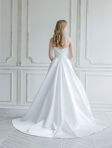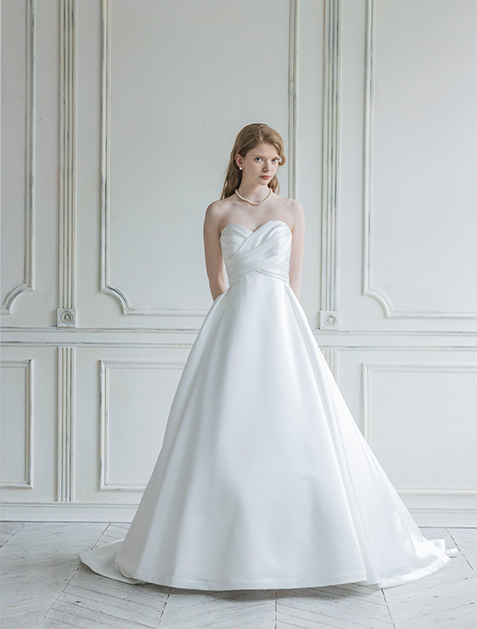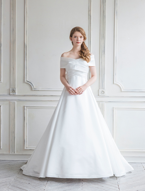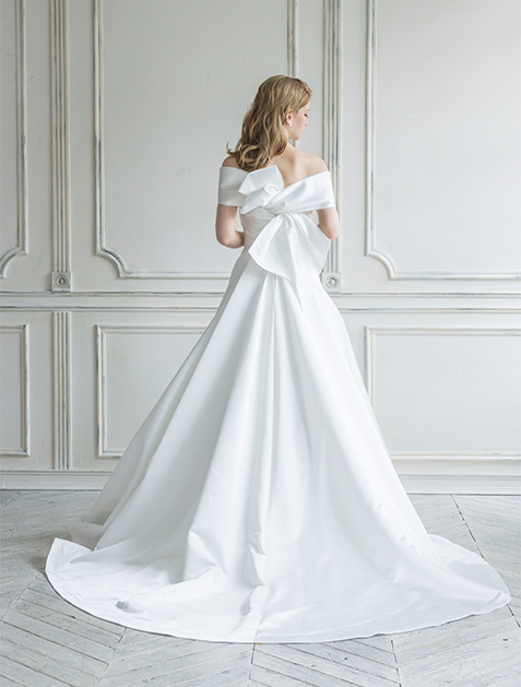 This wedding dress, highlighted by a distinctive asymmetrical ribbon at the back, is ideal for venues like restaurant weddings, offering a perfect balance of elegance. Its beautiful silhouette and the soft satin sheen accentuate the bride’s gentle charm. With a detachable cape, you can style it as a bare-shoulder look, with the cape, or paired with other vests, allowing you to create a personalized ensemble for your special day.