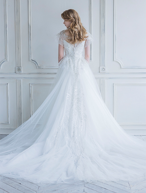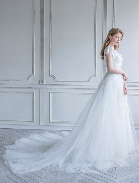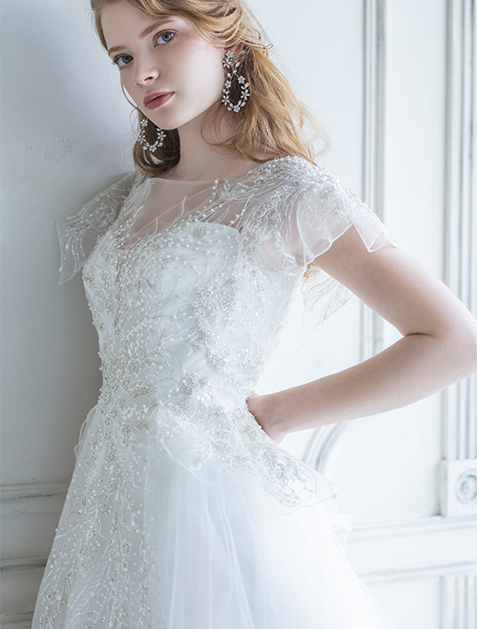 This wedding dress features delicate yet luxurious beaded embroidery that is sure to captivate guests. Its flowing tulle skirt enhances its charm with every movement, making it perfect for brides seeking a reception dress with a glamorous sparkle even when seated.