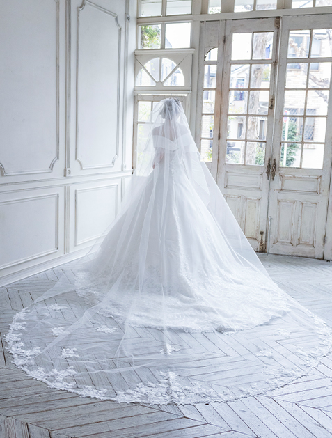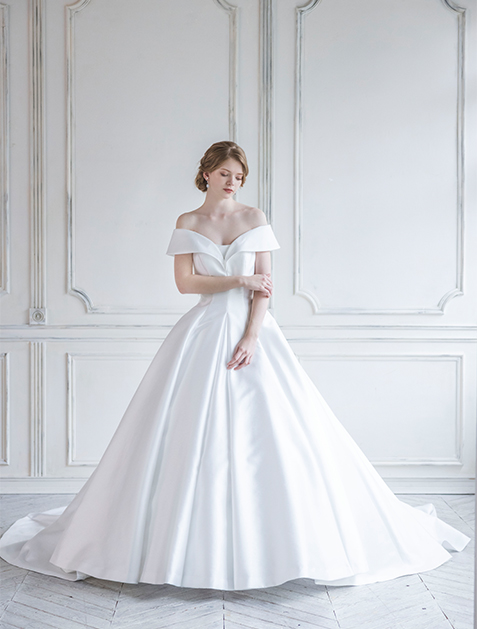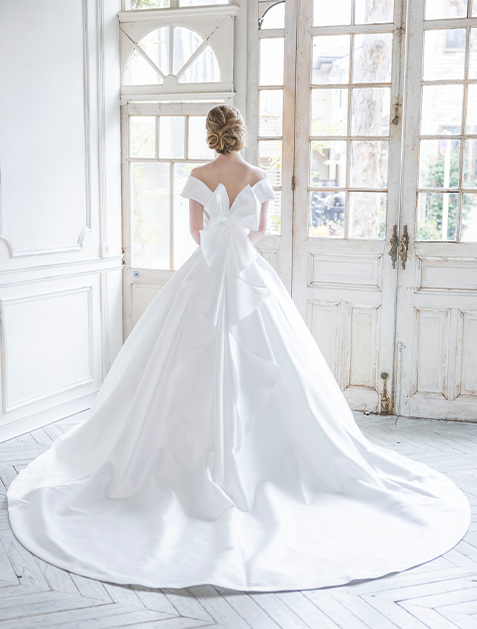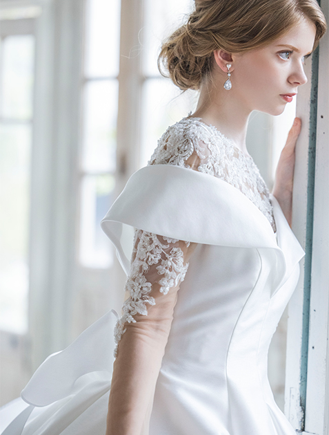This popular Monomaterial wedding dress is characterized by its elegant Mikado fabric with a refined sheen. A detachable lace bolero allows for a classical ceremony look and a stylish off-shoulder style for the reception entrance—perfect for surprising guests with a change in ambiance. The large back bow is also removable, allowing you to position it to your liking for a striking back view.