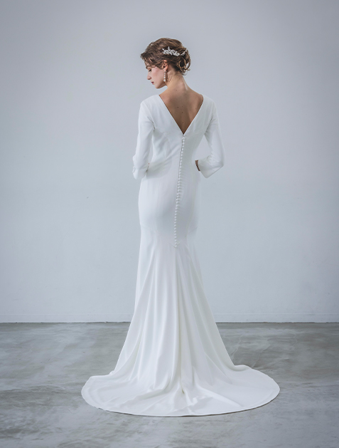 Introducing the Yumi Line dress, crafted to meet your desire for a high-quality, simple gown. Designed by Yumi Katsura renowned for exquisite fabrics and silhouettes, it offers an elegantly minimalist style without ornate lace or embellishments. The luxurious georgette fabric ensures a seamless fit, perfect for brides focused on silhouette. Featuring a subtle V-cut back and adorned with walnut buttons, it promises to captivate guests with its timeless elegance on your special day.