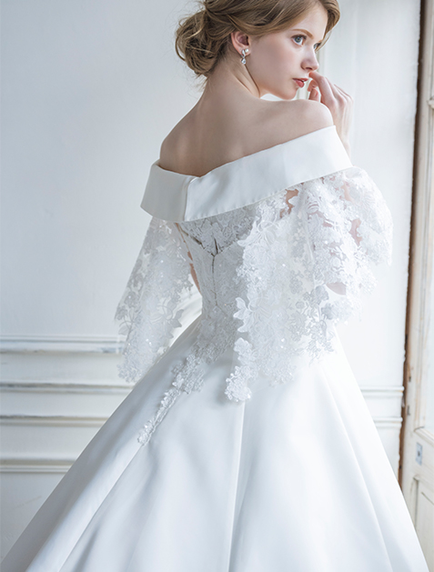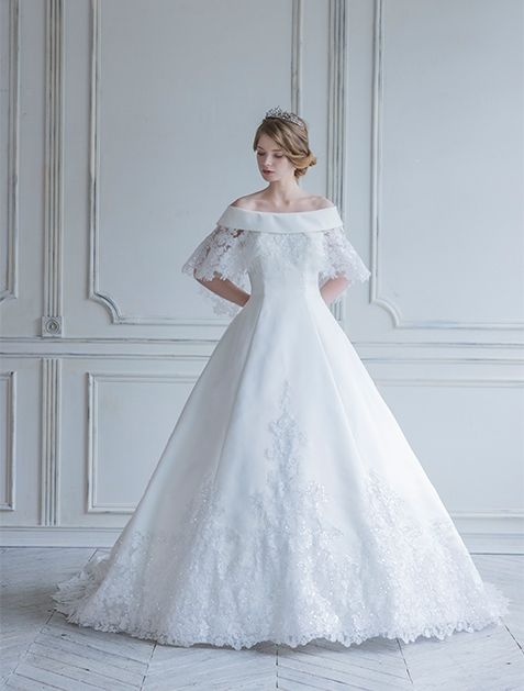 This princess-line wedding dress features elegant lace on lustrous satin, ideal for brides aspiring to a royal wedding. Choose between a lace-trimmed roll collar or a versatile bateau neckline. The lace appliqués arranged in an ascending pattern create a glamorous look and enhance leg length.