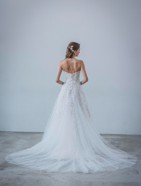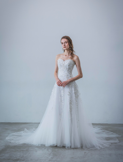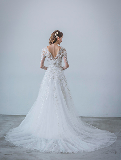 This dress features luxurious silver lace embroidery, creating a striking impression. The layered tulle skirt adds a sweet sense of volume without the need for a petticoat. Intricate lace patterns accentuate vertical lines, offering a flattering silhouette. With a detachable long-sleeve bolero, it offers a versatile two-way style for seamless transitions between ceremony and reception.
