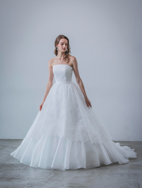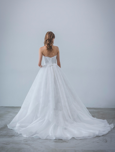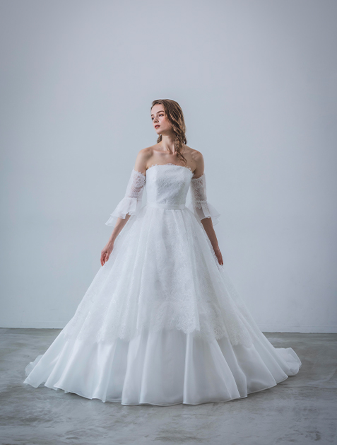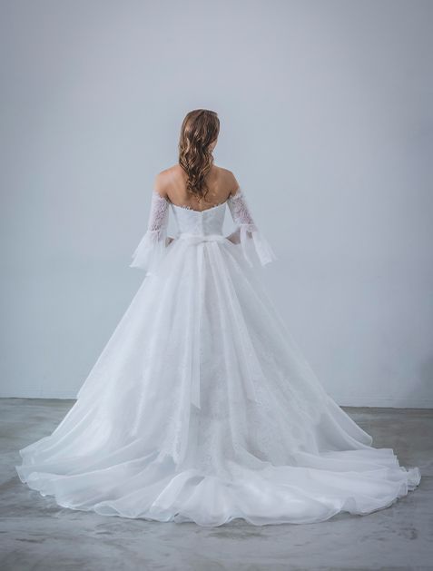 This dress featuring an impressive lace overlay on the overskirt. The modest puffed sleeves gracefully complement any movement, adding elegance to its charm. Whether worn with or without sleeves, its lightweight, translucent fabric makes it ideal for garden, resort, or destination weddings, ensuring an elegant and sophisticated bridal look.